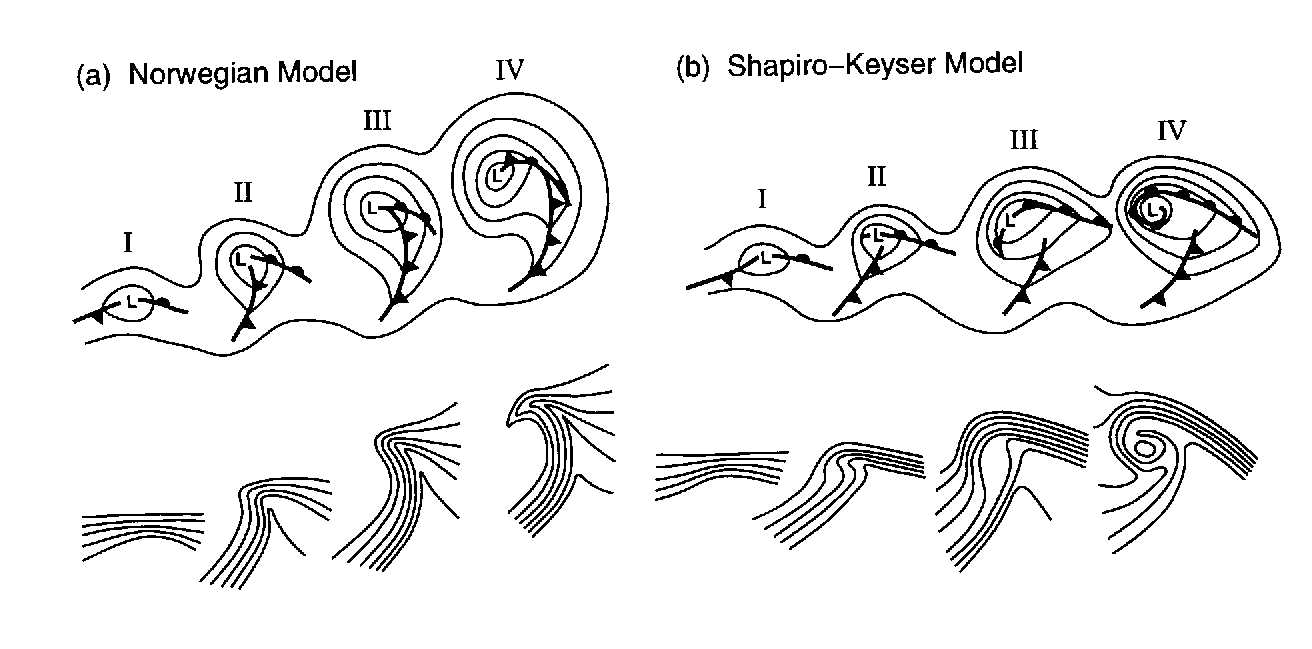 Dabei sind Kaltfront und Warmfront im Bereich des Tiefs als verbunden und werden durch das Tief separiert. Im weiteren Verlauf holt die Kaltfront irgendwann die langsamere Warmfront ein und okkludiert nachfolgend mit dieser. Der Kern des Tiefs ist dabei überwiegend von der kühleren Luftmasse beeinflusst. Auch wenn dieses Modell aus heutiger Sicht und Perspektive als überholt gilt und es mit der Cover-Belt-Theorie ein deutlich modernen Ansatz zur Erklärung der Fronten gibt, kann mit diesem Modell immer noch gut einsteigen.